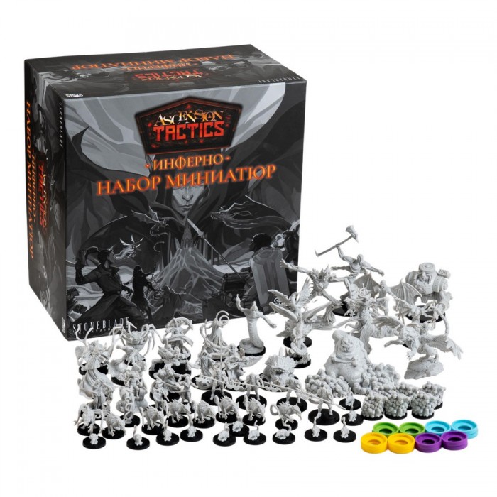 Ascension Tactics: Инферно. Набор миниатюр — это дополнение, которое превратит ваши карточные сражения в настоящее тактическое пиршество! 55 детализированных пластиковых миниатюр заменят картонные жетоны из базовой игры Ascension Tactics: Инферно, добавив визуального масштаба и эпичности каждому поединку.