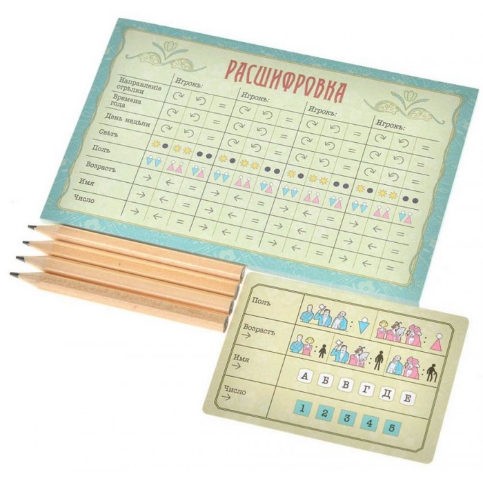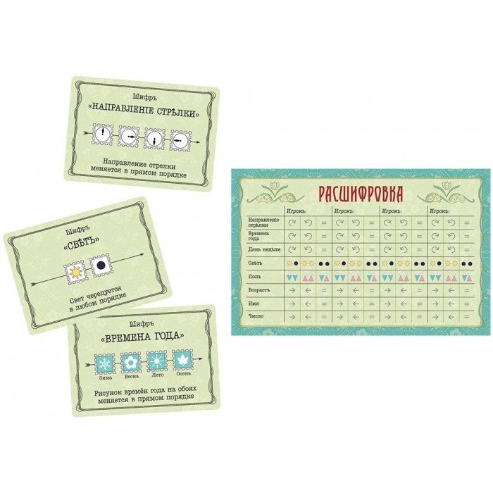 Каждый игрок получает секретную карту шифра — особое правило, определяющее, какие пары персонажей ему «подходят». Это может быть чередование пола, порядок времён года, направление стрелок и ещё пять других признаков.