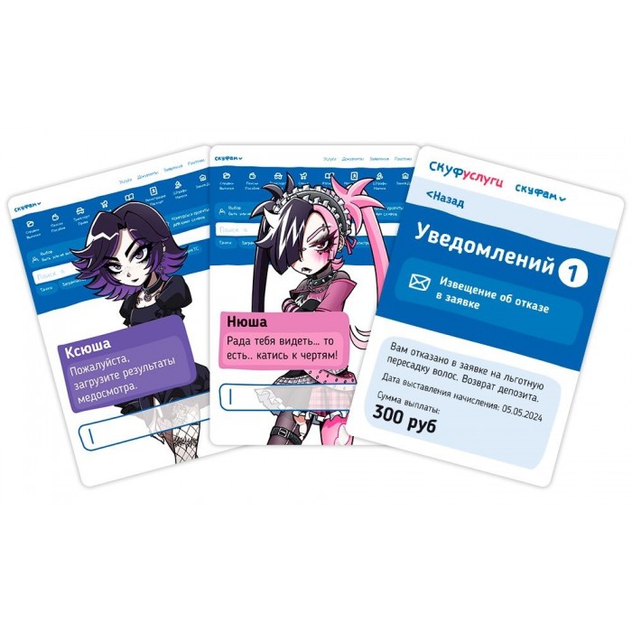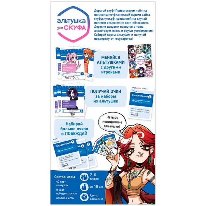«Альтушка для скуфа» — это простая карточная игра для компании, построенная на классической механике «собери четвёрку». Никаких сложных правил — только альтушки, скуфы и государственные выплаты.