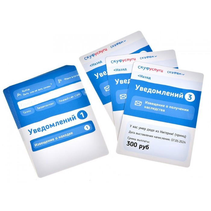 Игра заканчивается, когда кто-то забирает последнюю карту уведомлений. Подсчитываем очки на всех полученных уведомлениях — у кого больше, тот главный скуф вечера.