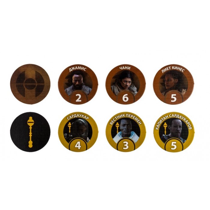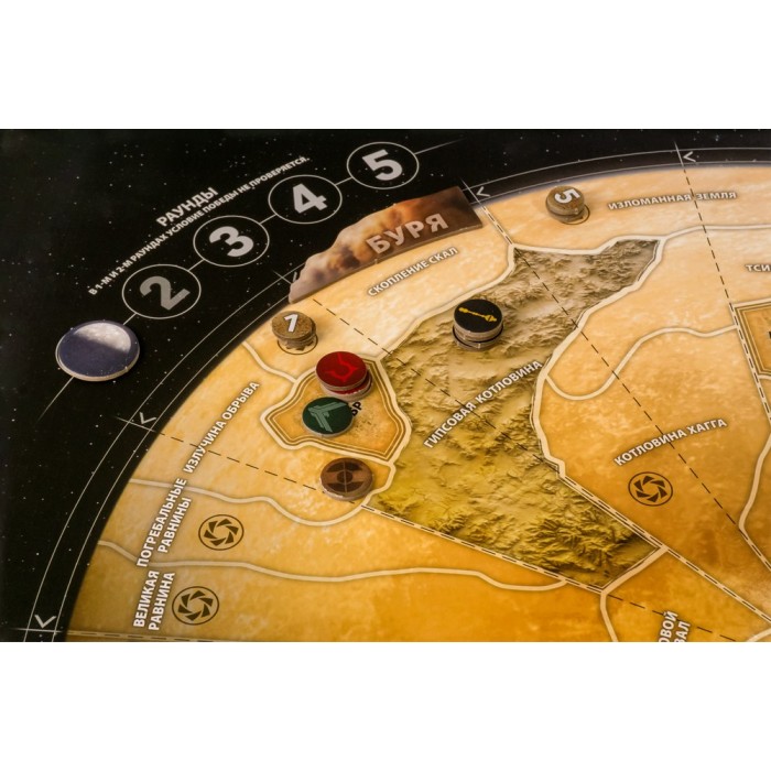 - Элемент случайности — кубики, колоды карт, появление червей — даже самый продуманный план может провалиться из-за непредсказуемости Арракиса