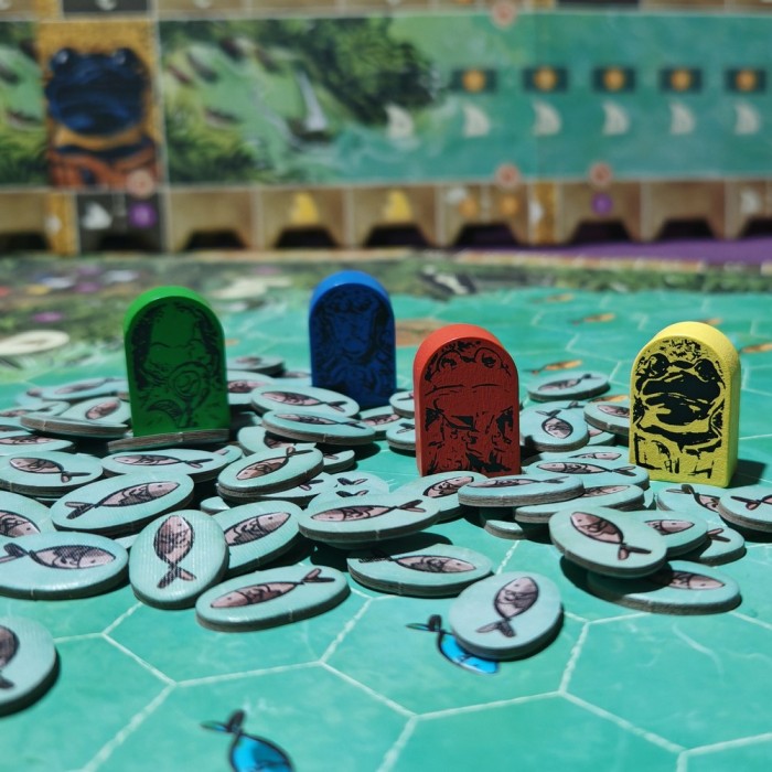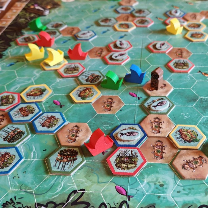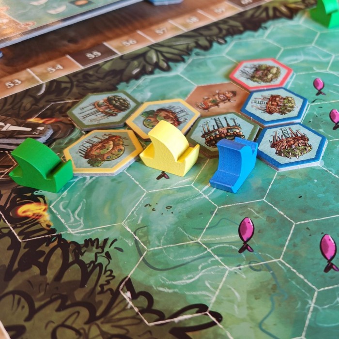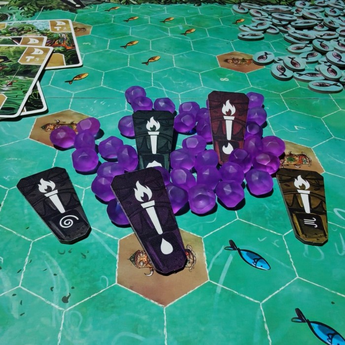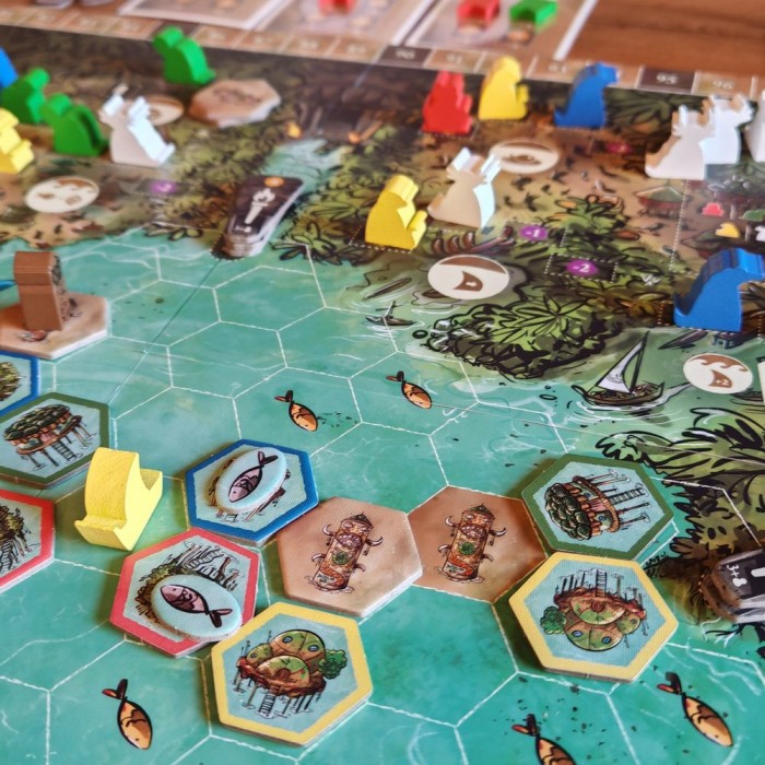 Каждый раунд начинается с выбора карты лидера — она определяет порядок хода, стоимость строительства, дальность плавания и особые способности. Затем вы действуете: возводите поселения, отправляете лодки за рыбой, разыскиваете древние храмы, торгуете с другими племенами и устраиваете празднества.