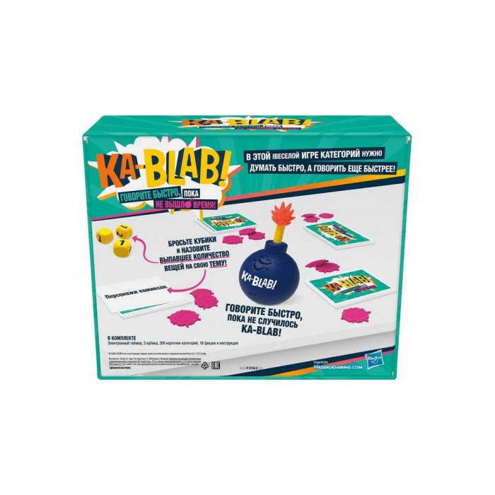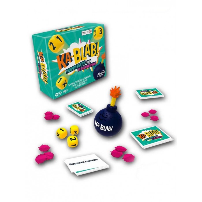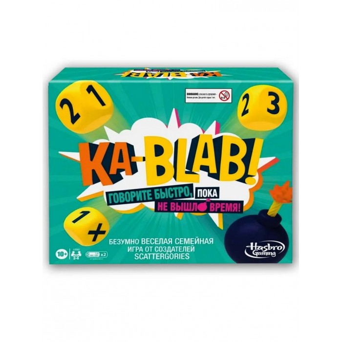 KA-BLAB (Ка-Блаб) — динамичная настольная игра от Hasbro, в которой игроки соревнуются в скорости подбора слов по выпавшим буквам и теме раунда. Игра отлично подойдёт для семейного досуга, вечеринок и детских праздников. Подходит для детей от 10 лет и взрослых. Каждая партия занимает 10–15 минут, правила максимально простые — можно начать играть сразу после распаковки. KA-BLAB развивает мышление, реакцию, словарный запас, внимательность и креативность, а также идеально подходит для больших и маленьких компаний — от 2 до 6 игроков. Уникальная механика со случайным «взрывным» таймером делает каждую игру непредсказуемой и весёлой. Отличный выбор для подарка, семейных игр, игр на вечеринку, соревнований и развлечения в дороге. Hasbro гарантирует качество компонентов и высокую реиграбельность.