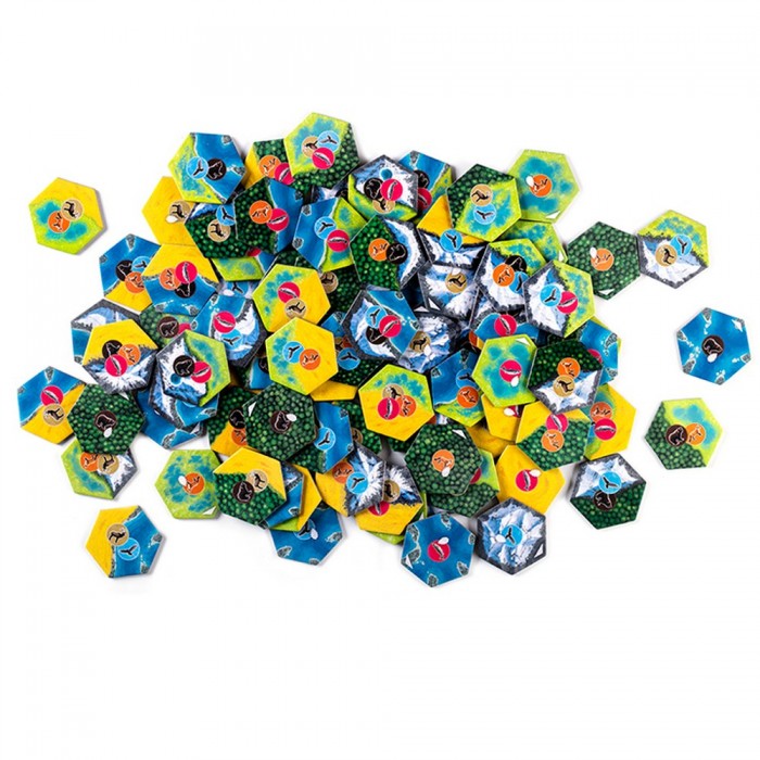 - 85 жетонов ареалов — горы, леса, луга, болота, реки