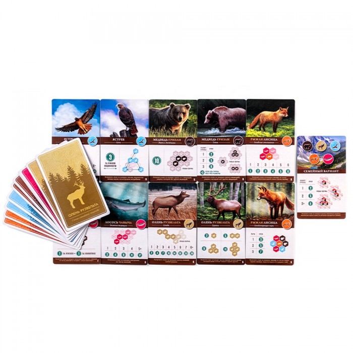 Реиграбельность. 20 карт целей для животных комбинируются в разные наборы. Каждая партия — новая головоломка.