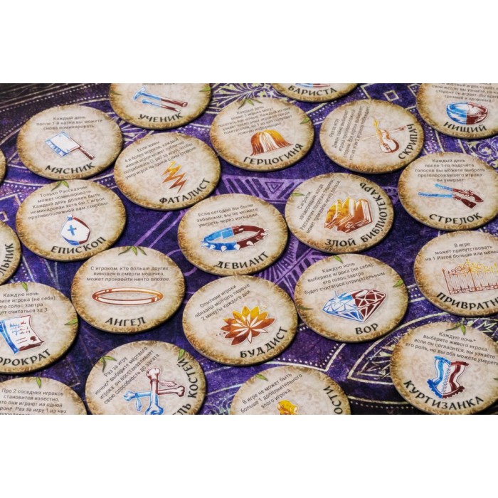 • 20 листов ролей, 26 жетонов ролей, 37 меток
