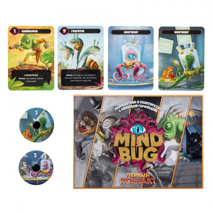 Mindbug: First Contact – революционная карточная игра от легендарного Ричарда Гарфилда, создателя Magic: The Gathering! Призывайте существ-гибридов и отправляйте их в бой, но будьте осторожны – противник может захватить контроль над вашими лучшими картами!