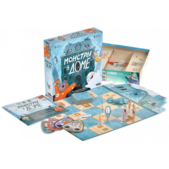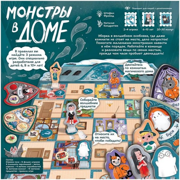 «Монстры в доме» — кооперативная настольная игра, созданная специально для семей с детьми. Вместе вы будете исследовать магический особняк, собирать волшебные предметы и возвращать их на свои места. Главная особенность — комнаты постоянно меняются местами, превращая каждую партию в новое приключение.