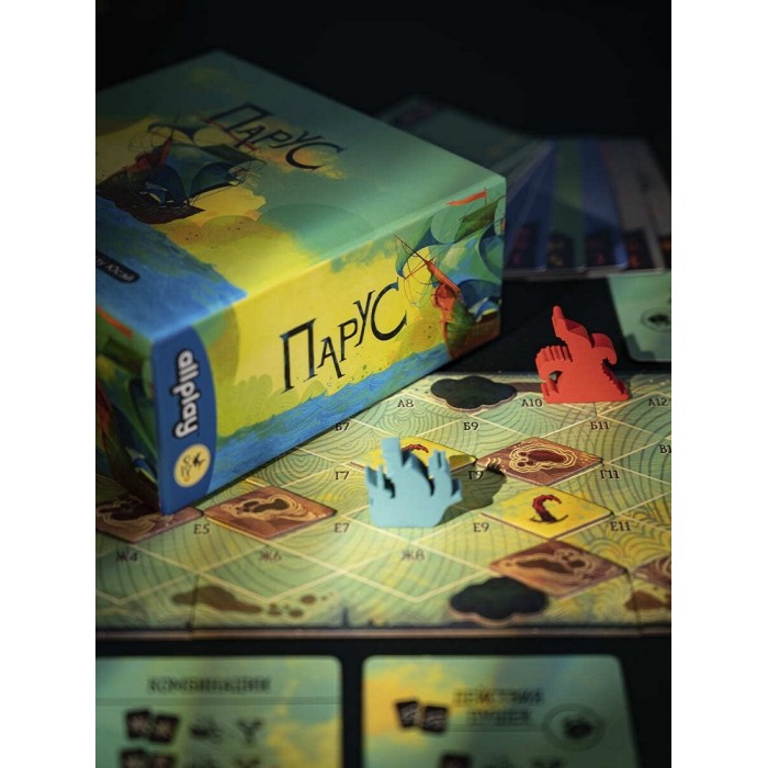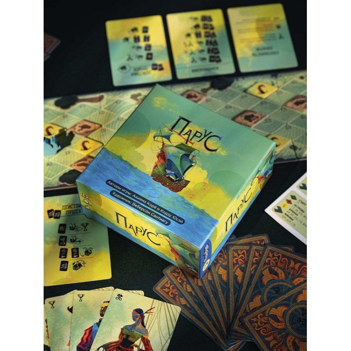 «Парус» — это кооперативная игра на взятки для двоих. Звучит как оксюморон? В этом и суть. Здесь важно не просто выигрывать взятки — важно чередовать победы и поражения в нужном ритме, чтобы двигать корабль, избегать штормов и не разбудить Кракена.