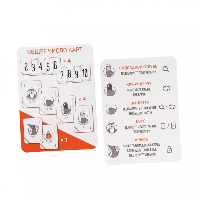 Стань криминальным авторитетом в мире пернатых! В этой дерзкой карточной игре вы возглавляете банду, где завелся стукач, а полиция уже на хвосте. Ваша цель — сбросить подозрения и подставить соперников. Действуйте быстро: избавляйтесь от свидетелей, вычисляйте предателей и подбрасывайте улики врагам! Готовьтесь к конфликтам, блефу и удару картой по столу. Победит лишь один — самый хитрый, быстрый и беспринципный. Не расслабляйтесь: лидерство меняется мгновенно, а тот, кто решит закончить игру, рискует получить груз доказательств! Динамичный микс памяти, реакции, блефа и удачи затянет вас в свои преступные сети.