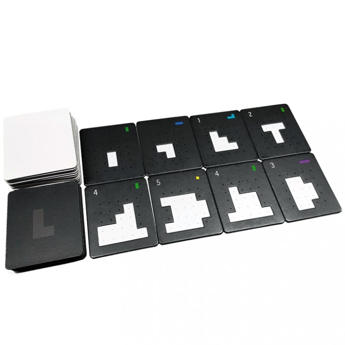 Каждая карточка задания представляет собой форму с пустыми клетками, которые нужно заполнить фигурами. Белые карточки дают фигуры в награду, чёрные карточки приносят больше очков, но требуют более сложных комбинаций. Планируйте заранее — какие фигуры вам понадобятся для следующих заданий!