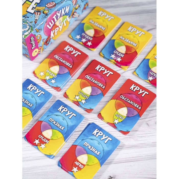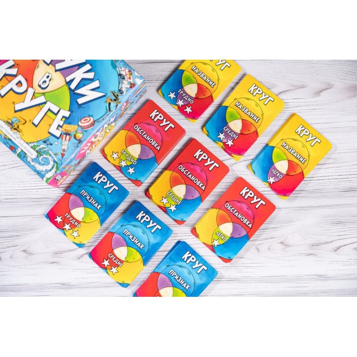 У каждого игрока — рука карт с разными «штуками»: предметами, существами, абстракциями. Три круга на столе — красный, жёлтый, синий — управляются секретными правилами. Может быть, в красный круг можно класть только живое? Или только то, что помещается в карман? Или всё, что начинается на определённую букву?