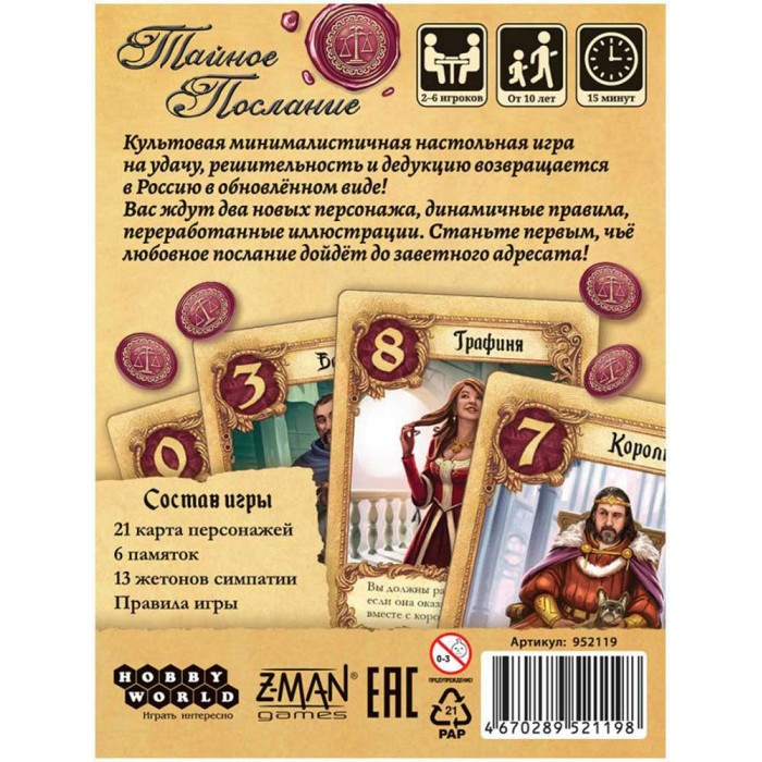 "Тайное Послание" — это игра, которая объединяет элементы стратегии, везения и психологии, создавая напряженную и увлекательную атмосферу придворных интриг в каждой партии.