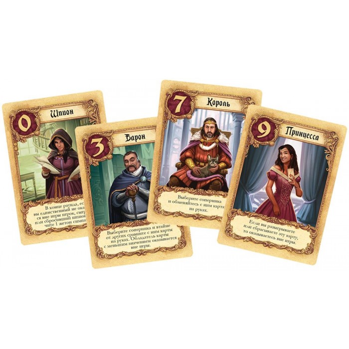 Игра проходит в несколько раундов. В каждом раунде игроки по очереди берут карту из колоды и разыгрывают одну из двух карт на руке. Каждая карта имеет уникальный эффект: можно посмотреть карту соперника, заставить его сбросить карту, сравнить значения карт или получить защиту от чужих воздействий.