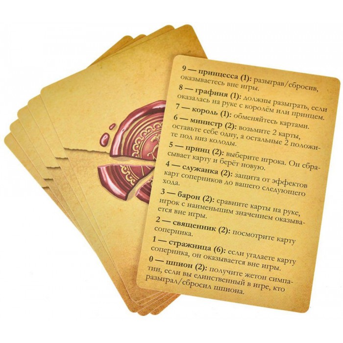 Простые правила, глубокая стратегия: Каждый ход игрок берет одну карту и разыгрывает одну из двух имеющихся, применяя ее уникальный эффект. Несмотря на простоту механики, игра требует тактического мышления и умения читать намерения соперников.