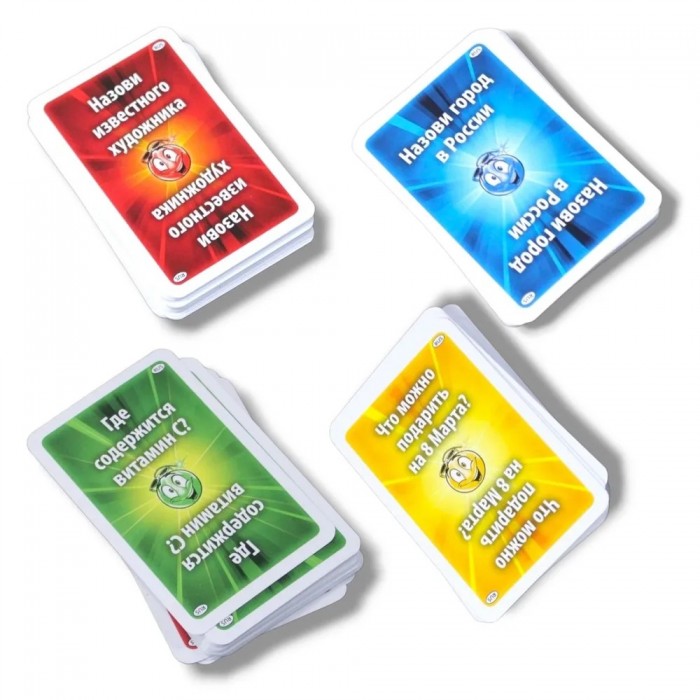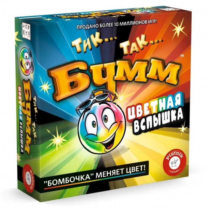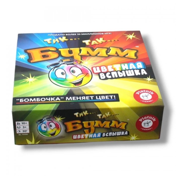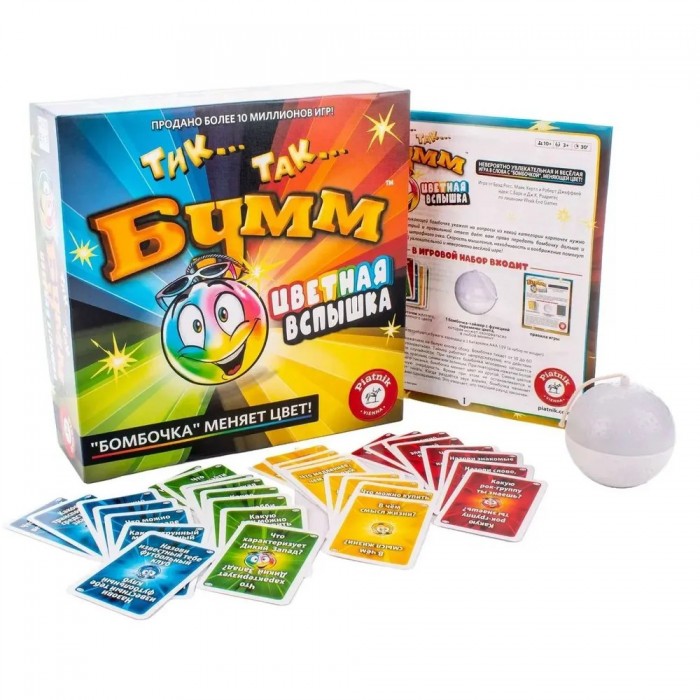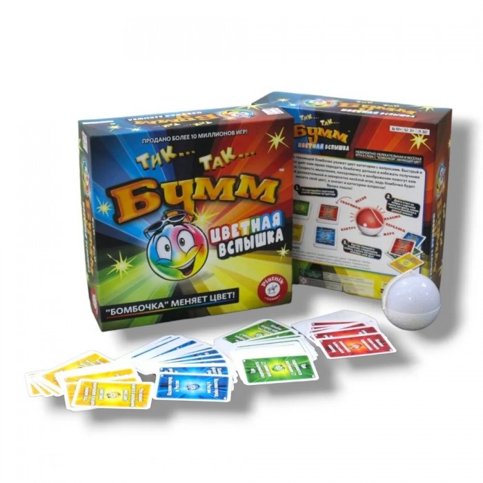 Яркая новинка в популярной линейке игр "Тик Так Бумм" с цветной вспышкой на тикающей бомбочке, которой указывает цвет категории с вопросами. Быстрый и правильный ответ даёт право игрокам передать бомбочку дальше и избежать получения штрафного очка. Скорость мышления, находчивость и воображение помогут участникам победить в этой увлекательной и невероятно весёлой игре, ведь бомбочка будет менять свой цвет, а значит и категорию вопросов.