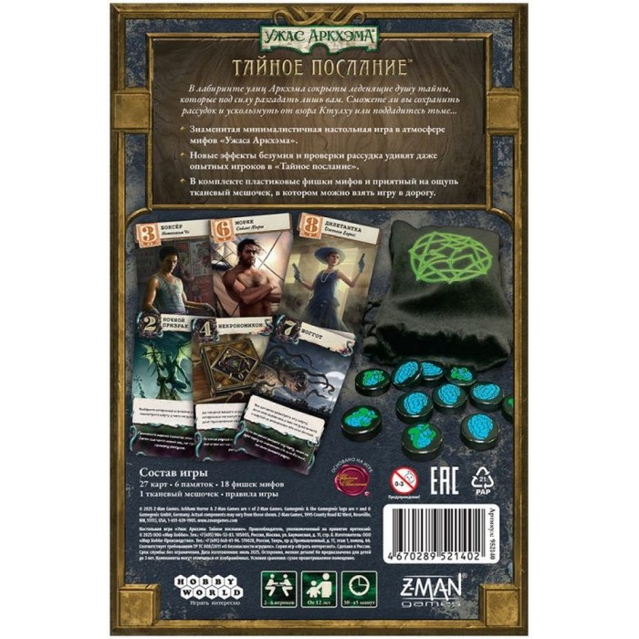Ужас Аркхэма: Тайное послание — это минималистичная карточная игра в сеттинге мифов Ктулху, основанная на классической механике "Тайного послания". Вы станете сыщиком, расследующим зловещие тайны Аркхэма, где каждый шаг может привести к безумию или славе.