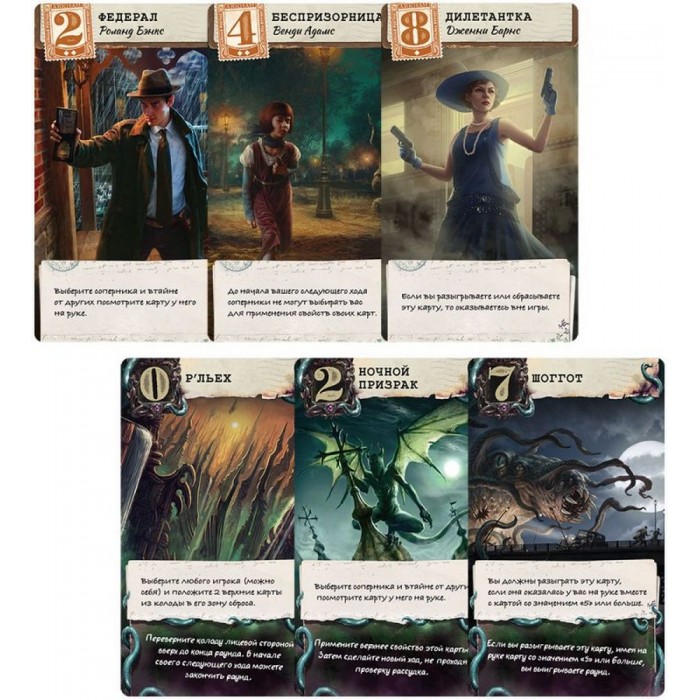 - Атмосфера Лавкрафта — каждая карта погружает в мир мифов Ктулху и древних ужасов