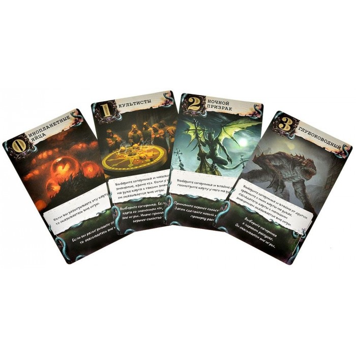 - Путь к победе — первым соберите 3 фишки рассудка, 2 фишки безумия или используйте древнюю силу карты Ктулху