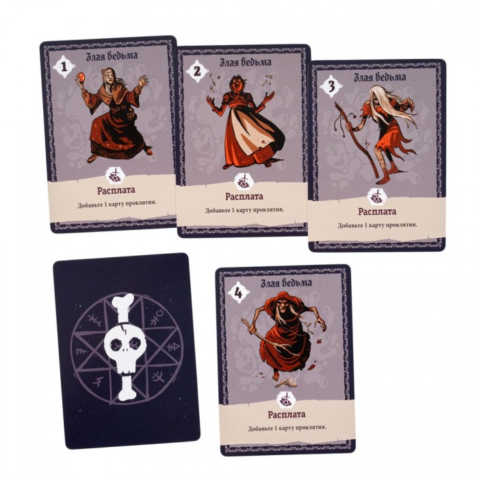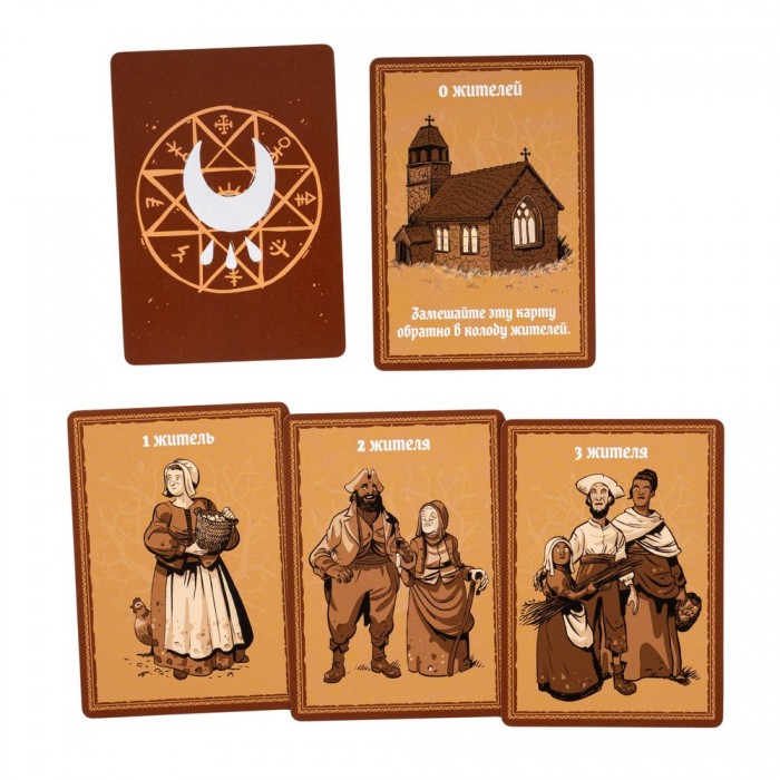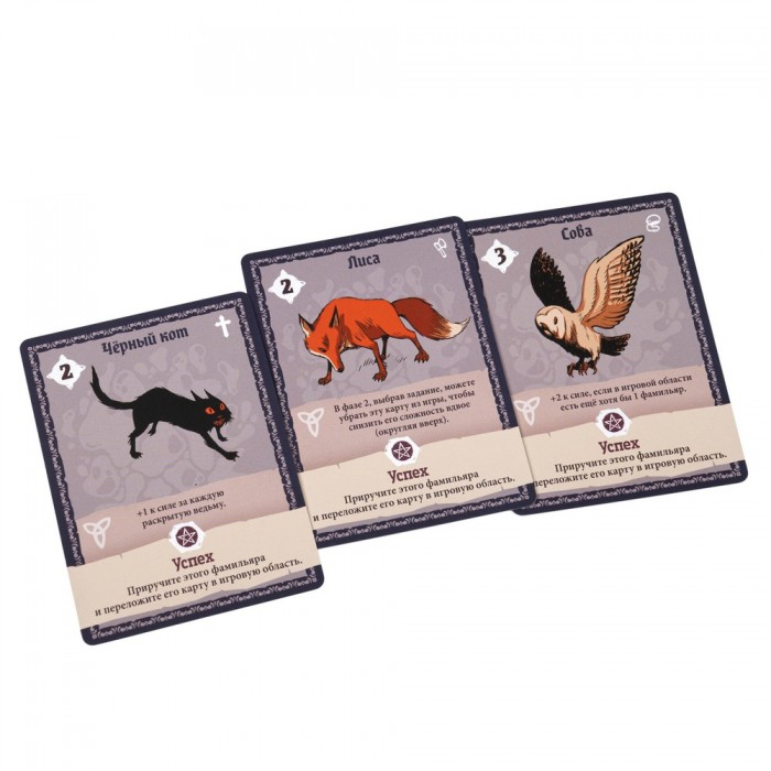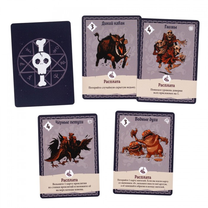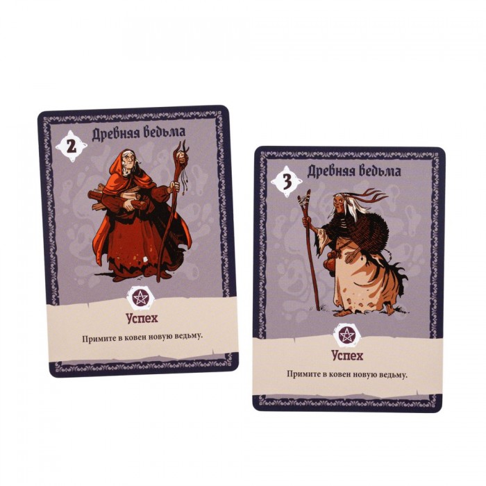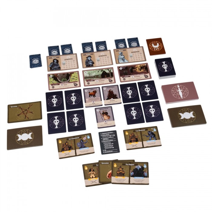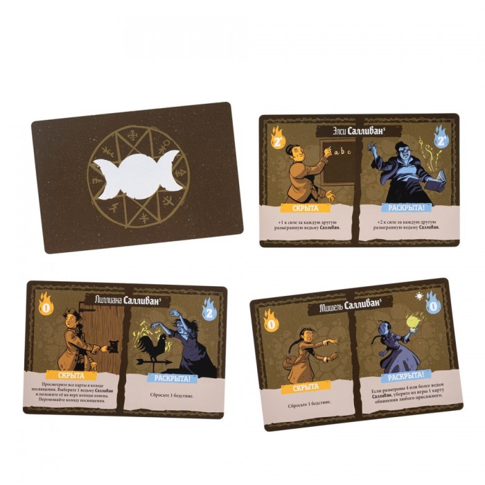 В начале партии вы собираете ковен из женщин — представительниц разных деревенских семей. Каждая ведьма выполнена в виде карты с двумя сторонами: левая половина отвечает за скрытые действия, правая — за открытое колдовство. Чем больше ведьм из одной семьи в вашем ковене, тем сильнее их магия.