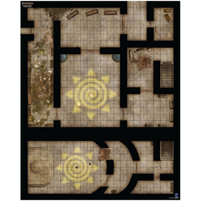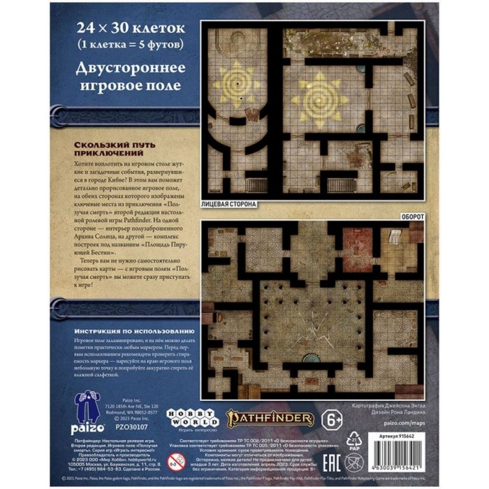 Поле размечено на клетки по 5 футов — стандарт для Pathfinder. Размер игровой области 24×30 клеток на каждой стороне. Ламинированная поверхность позволяет делать пометки маркером и легко стирать их после сессии.